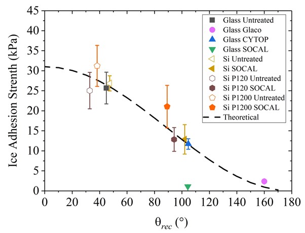 For coatings, it is believed the practical work of adhesion, Wadh=gLV(1+cosqrec), determined by the water receding contact angle, qrec, might correlate with the ice adhesion strength [2]. The figure above shows the one of the best hydrophobic coatings in reducing ice adhesion strength (Cytop – Blue triangle ) is outperformed by both a superhydrophobic coating (Glaco – Purple circle) and a slippery omniphobic covalently attached liquid-like coating (SOCAL – Green triangle) [3].